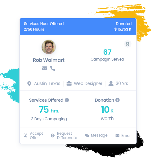 The Volunteer Card translates data from one’s charitable efforts into an organized personable snapshot. This convenient visual tool allows impact to be tracked, measured, and showcased. Taking the step to discover an ideal campaign is simple. Direct communication is streamlined for instantaneous communication.